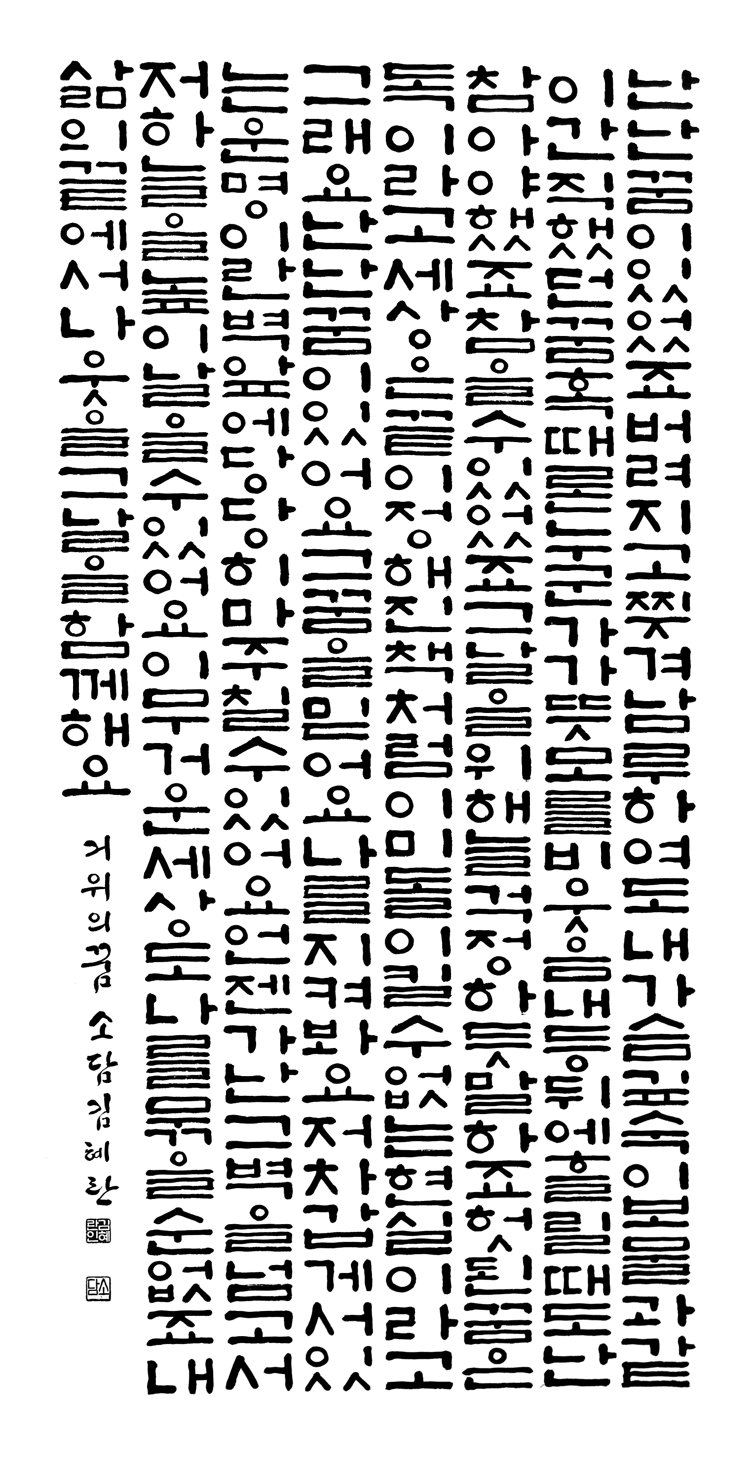 만약 전통에 매여서 옛 글씨를 그대로 쓰기위해 고심한다면 이는 정신성이 결여된 오로지 형식의 유사성만을 따르는 것이될 것입니다. 그러나 전통이 없이 현대란 있을 수 없으며, 우연히 얻게 되는 것 또한 내면의 良知와 良能에서 표현된 것일 것입니다.