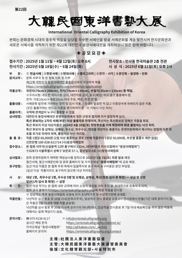 제22회 동양서예초대작가전의 개막을 맞아, 오랜 세월 서예 한 길을 걸어오신 원로 작가님들과 한국 서예계를 이끌어가고 계신 중견 작가님들께 깊은 경의와 감사의 마음을 전합니다.